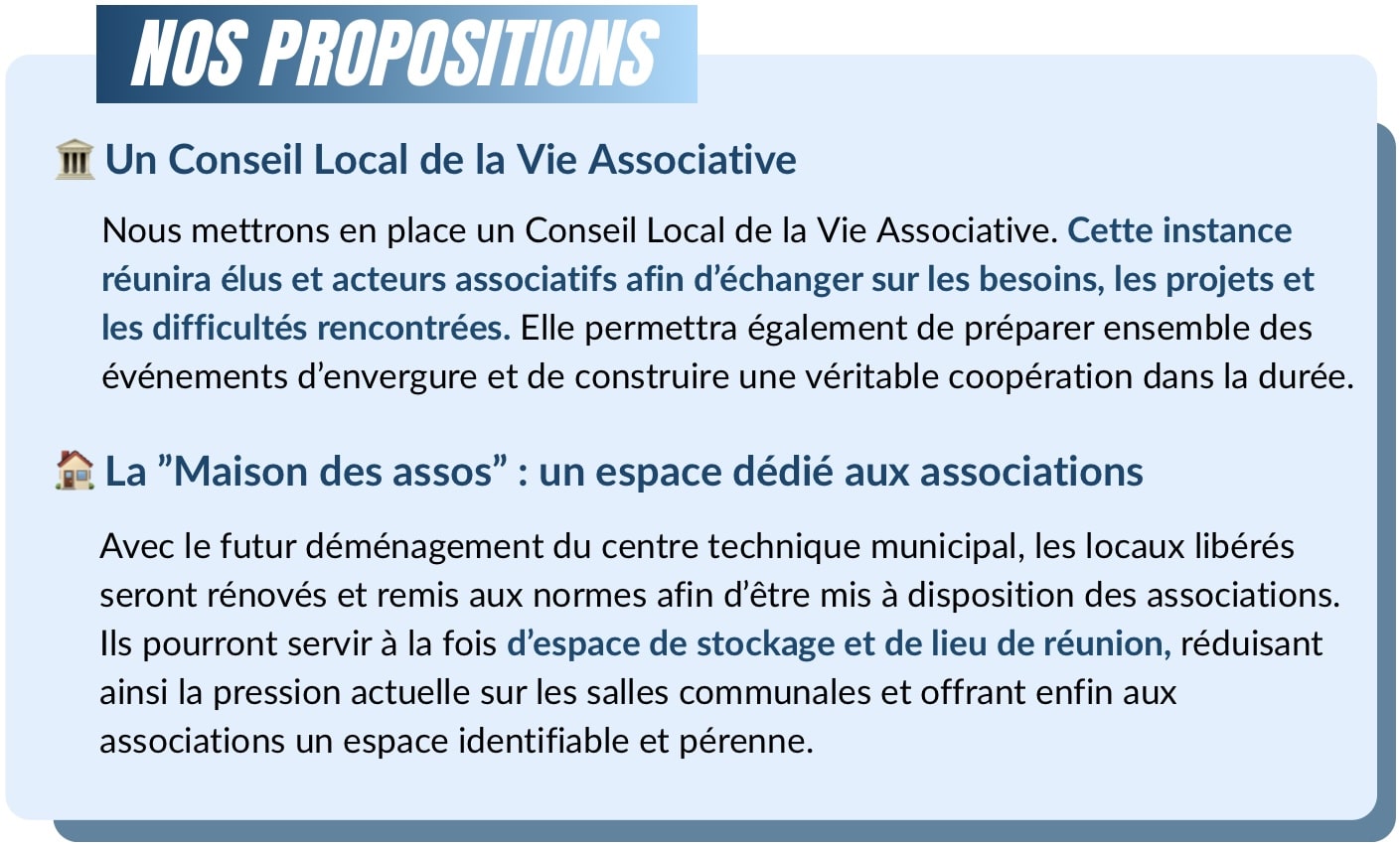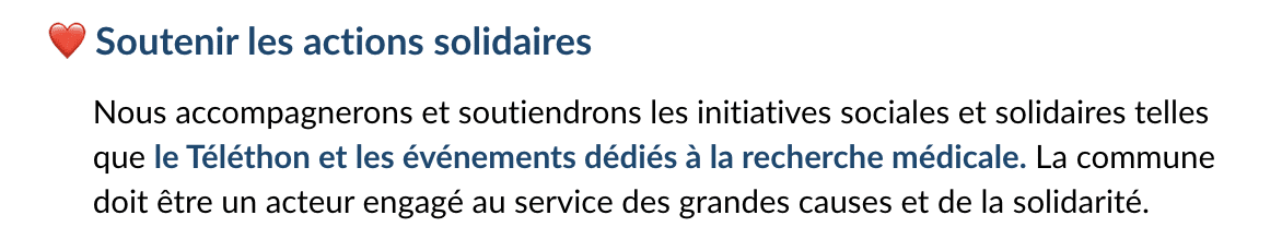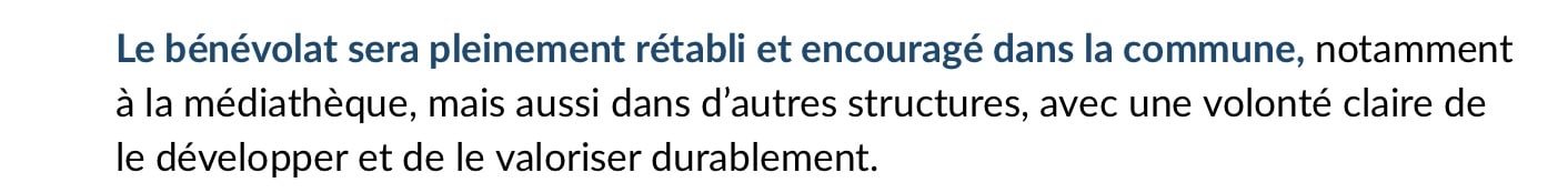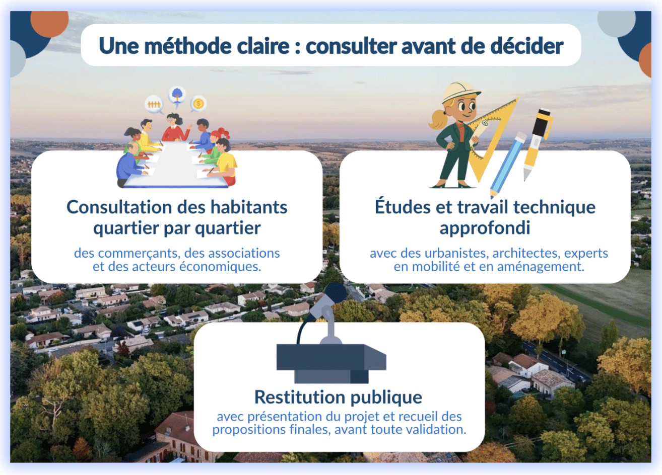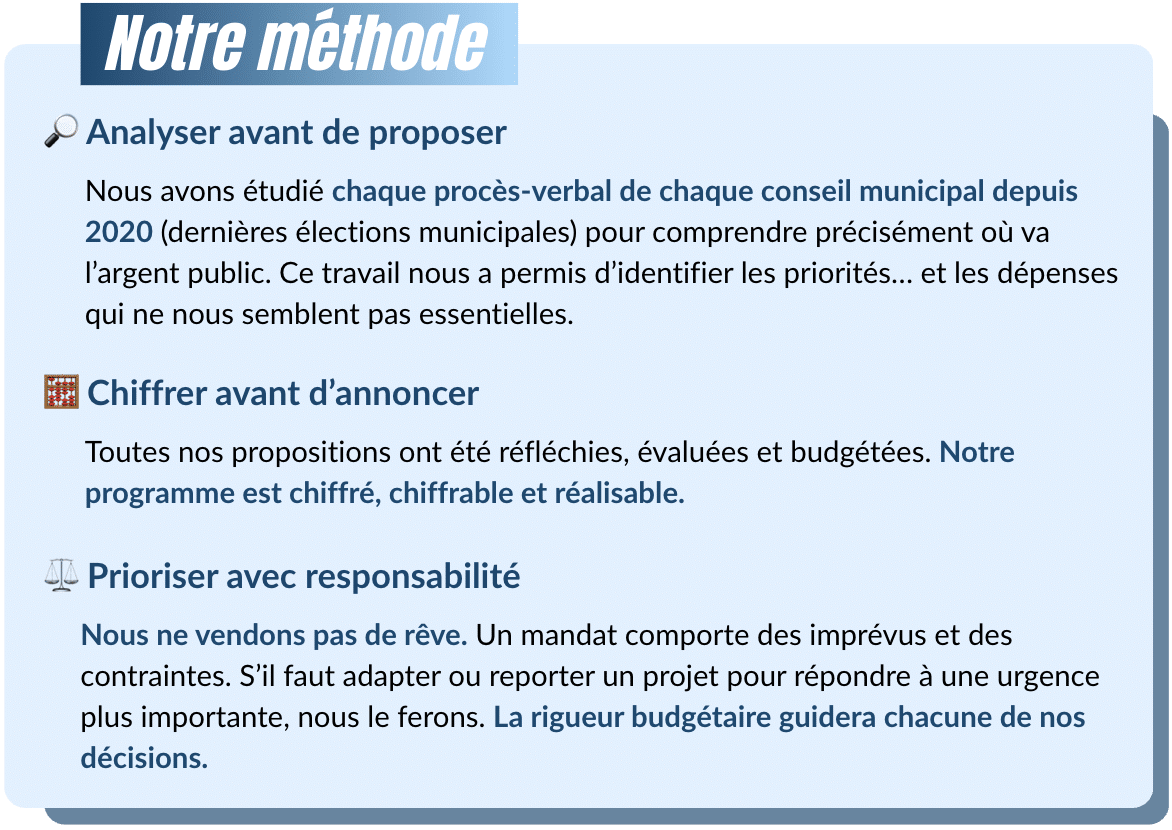 Ce programme est le fruit d’une véritable concertation. Grâce à notre sondage, à nos rencontres de terrain et à nos échanges avec les commerçants, entreprises, jeunes, aînés, associations, collectifs, experts et partenaires institutionnels, nous avons écouté avant de proposer.